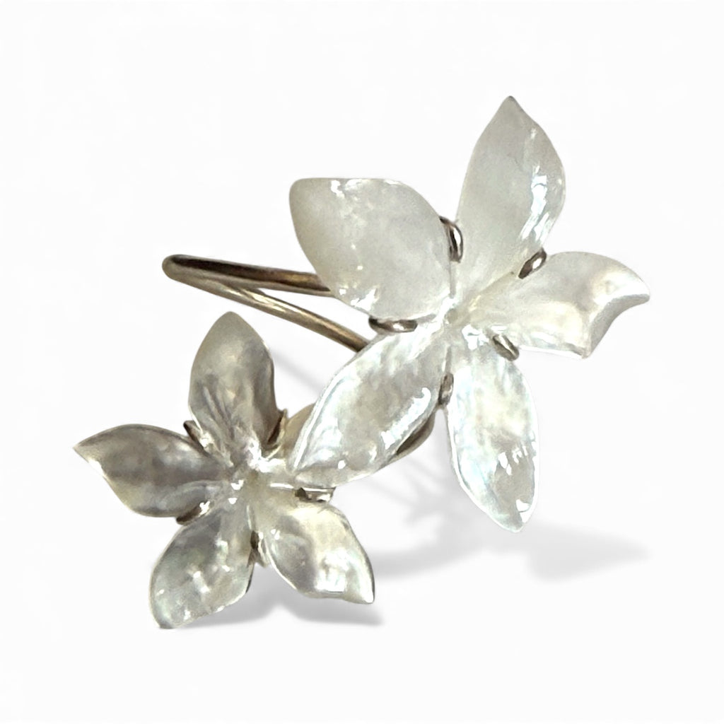 Delicately crafted from luminous mother of pearl and set in sterling silver, this adjustable ring captures the timeless elegance of the jasmine flower—a symbol of femininity, grace, and beauty.